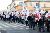 ![]() Protest rozpoczął się na pl. Piłsudskiego; stamtąd związkowcy przeszli kolejno przed Ministerstwo Finansów, Sejm i Kancelarię Prezesa Rady Ministrów, gdzie złożyli skierowaną do premiera Donalda Tuska petycję z postulatami, w której domagali się m.in. waloryzacji wynagrodzeń, odstąpienia rządu od zamiaru zamrożenia płac w budżetówce od 2011 r., rezygnacji z planu redukcji zatrudnienia w sektorze publicznym oraz rezygnacji z finansowania bieżącej działalności służb mundurowych ze środków należnych funkcjonariuszom. Manifestację otwierał czerwony angielski autobus. Na jego piętrze grała orkiestra górnicza. Protestujący hałasowali przy użyciu trąb, syren i gwizdków. Mieli ze sobą transparenty z napisami: "Głodny na straży lodówki to głupi pomysł", "Panie premierze, chcąc zredukować wagę ciała o 10 proc., którą część ciała pan sobie obetniesz?", "Strażak broni i ratuje, a minister oszukuje" oraz "Skarbówka zbiera podatki (także na koryto władzy)". Przed Ministerstwem Finansów część demonstrantów przekłuła baloniki z napisem: "Budżet 2011". Wśród demonstrantów była też grupa pracowników skarbówki, ubranych w worki przepasane sznurkiem. Za nimi z batem w ręku szedł związkowiec przebrany za ministra finansów Jacka Rostowskiego. Przed Sejmem przemawiali liderzy "Solidarności" i OPZZ. Janusz Śniadek zarzucił politykom, że nie zajmują się problemami zwykłych ludzi. Mówił, że władza oszczędza na pracownikach, a związkowcy domagają się nie podwyżki, a waloryzacji wynagrodzeń. Pracownicy wychodzą na ulice, kiedy zagrożony jest ich byt - stwierdził. Z kolei Jan Guz podkreślał, że pracownicy budżetówki wychodzą na ulice, bo stracili cierpliwość do rządu, który ich kosztem chce łatać dziurę budżetową. Pracownicy wychodzą na ulice, kiedy zagrożony jest ich byt - stwierdził szef OPZZ. Jego zdaniem rząd szuka oszczędności nie tam, gdzie powinien. Fot: Dominik Różański/www.solidarnosc.org.pl. |
