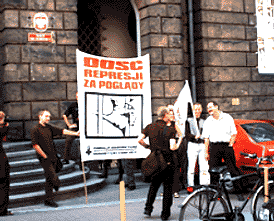 ![]() Przypomnijmy – 11 działaczy środowisk wolnościowych zostało zatrzymanych tuż po rozpoczęciu pikiety 15 listopada, która była sprzeciwem wobec amerykańskich bombardowań Afganistanu. Postawiono im zarzut „nierozejścia się na wezwanie funkcjonariusza” (50 KW), choć jak twierdzą wszyscy oskarżeni – żadnego wezwania nie słyszeli. 12 kwietnia br. miał się rozpocząć proces, jednak z powodu popełnionych błędów proceduralnych, sprawę przesunięto. Kwietniowa decyzja sędziny, która zabroniła dziennikarzom sporządzania notatek, nie wyłączając jawności rozprawy (co nie ma podstawy prawnej) wywołała skandal. Dziennikarze wystosowali w tej sprawie protest do prezesa sądu. Dziś przed gmachem sądu poznańscy anarchiści zorganizowali pikietę popierającą oskarżonych. |