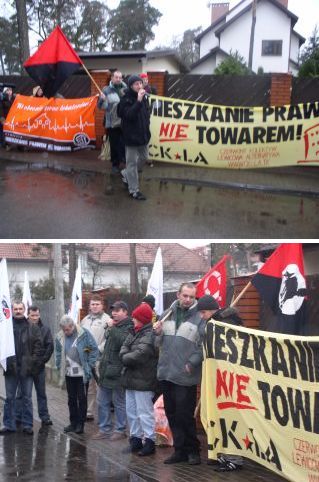 ![]() Pikietę zorganizowała kampania "Mieszkanie Prawem nie Towarem". Wzięli w niej udział działacze ATTAC, Czerwonego Kolektywu-Lewicowej Alternatywy, Grupy na rzecz Partii Robotniczej, Młodych Socjalistów, Polskiej Partii Pracy, Wolnego Związku Zawodowego "Sierpień`80", lokatorzy współpracujacy z kampanią MPnT oraz grupa okolicznych mieszkanców. Lokatorka z budynku mówiła o tym w jaki sposób kamienicznik Józef Piaszczyński odciął jej rodzinie przewód kominowy. Wspomniała równiez że pomimo iż lokatorzy płacą czynsz, kamienicznik twierdzi że nalezy mu się od nich odszkodowanie za "bezprawne zamieszkiwanie", nie chcąc nawet podać jego wysokosci. Lokatorów wciąż spotykają równieższykany, takie jak dewastacja klatki schodowej przez "nieznanych sprawców". Niech pan zabierze śmieci, które w tajemniczy sposób pojawiły się pod moimi oknami, panie Piaszczyński - powiedziała lokatorka budynku Mieczysława Zatorska. Zebrani jako dowód prowokacyjnego zachowania kamienicznika pokazywali plakaty, które pojawiły sie w okolicy przed akcją, sugerujące jakoby jej tematem była walka o prawo adopcji dla gejów i których autor nie umiał nawet poprawnie podać nazw organizacji broniących lokatorów. Chcemy przypomnieć Józefowi Piaszczyńskiemu, że lokatorzy nie są meblem, który można kupić, sprzedać i dowolnie przesuwać - powiedział Piotr Ciszewski z CK-LA. Marcin Płaczek z WZZ "Sierpień`80" i PPP stwierdził, że problem nie dotyczy tylko jednej kamienicy, ale wynika ze zmian w prawie lokatorskim, które odebrały lokatorom większość sposobów obrony, a wprowadzonym miedzy innymi przez "solidarny" PiS. Dodał, że kamienicznik miał szansę przemówić ludzkim głosem i negocjować z lokatorami, ale tego nie zrobił. Będziemy reklamować pana, panie Piaszczyński i pańską firmę "Kominiarz" w taki sposób, aby lokalna społeczność wiedziała co robi pan z lokatorami - powiedział Andrzej Smosarski z CK-LA. Życzył również kamienicznikowi aby zobaczył, że z drugiej strony też są ludzie i zaczął rozmawiać zamiast walczyć. |