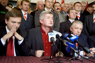 ![]() Podczas konferencji prasowej Andrzej Lepper mówił, że Samoobrona jest partią antywojenną i konsekwentnie opowiadała się przeciwko udziałowi polskich wojsk i wojnie w Iraku i w Afganistanie. Lepper wskazywał także na zagrożenia związane z budową w Polsce amerykańskich baz rakietowych, wśród nich wymieniał groźbę ataku terrorystycznego i utratę przez Polskę części niepodległości. Podczas konferencji doszło także do poważnego zgrzytu pomiędzy Leszkiem Millerem, a Piotrem Ikonowiczem. Miller stwierdził, że wobec Saddama Husajna nie można było znaleźć żadnych okoliczności łagodzących i był to zbrodniarz zasługujący najwyższą karę. Miller mówił, że niestosowne jest nazywanie obecności polskich wojsk w Iraku okupacją, stwierdził że Polacy nie mają krwi na rękach i rola wojska sprowadza się do akcji charytatywnych. Były premier wyraził także zadowolenie z procesu demokratyzacji, zachodzącego jak uznał, w Iraku. Na te słowa ostro zareagował lider Nowej Lewicy. Piotr Ikonowicz mówił, że demokracji nie zaprowadza się pod lufami karabinów. Jego zdaniem Irak powinien zostać oddany Irakijczykom, a Amerykanie i Polacy są odpowiedzialni za destabilizację sytuacji politycznej w całym regionie. Ikonowicz przypominał także, że amerykańscy najemnicy każdego dnia dokonują zabójstw w Iraku, a proces nazwany przez Millera demokratycznym najjaskrawiej pokazuje fakt, że zarządzający Irakiem nie są w stanie poruszać się inaczej niż w konwojach poza tzw. zieloną strefą w Bagdadzie. W imprezie Samoobrony wzięło udział ponad 100 osób. |
