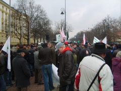 ![]() Protest rozpoczął się przed Ministerstwem Rolnictwa, gdzie przedstawiciele związków rolniczych chcieli spotkać się z szefem resortu Markiem Sawickim. Minister ani żaden jego przedstawiciel jednak do nich nie wyszedł. Demonstracja przeszła pod Kancelarię Premiera, w której delegacja protestujących złożyła petycję w sprawie sytuacji w rolnictwie. Rolnicy domagają się przyspieszenia wdrożenia dopłat do eksportu wieprzowiny, ograniczenia przemysłowego tuczu trzody chlewnej oraz możliwości odłożenia w czasie spłaty rolniczych kredytów. Demonstranci sprzeciwiali się także otwierania polskiego rolnictwa na organizmy modyfikowane genetycznie (GMO). Postulaty związków zawodowych reprezentujących rolników poparł klub parlamentarny Prawo i Sprawiedliwość. W organizację rolniczych protestów zamierza włączyć się także Samoobrona RP, która chce na przełomie lutego i marca zablokować drogi w całym kraju. |