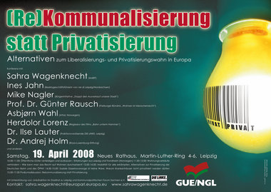 ![]() W pierwszej części konferencji wystąpiła organizatorka imprezy, Sahra Wagenknecht, deputowana Lewicy w Europarlamencie i omówiła problemy, związane z postępującą prywatyzacją w całej Europie, szczególnie dotkliwą w wypadku wyprzedaży mienia komunalnego. Przedstawiła jednocześnie próby oporu, podejmowanego przeciwko tym liberalnym tendencjom przez lewicę, związki zawodowe i organizacje pozarządowe, czego przykładem są inicjatywy przeciwko "Dyrektywie Bolkesteina" czy generalnie umowom GATS. Ponadto swoje referaty wygłosili: dr Ilse Lauter (Die Linke, Leipizg) oraz Mike Nagler (przedstawiciel lokalnej inicjatywy sprzeciwiającej się prywatyzacji mienia komunalnego). Asbjorn Wahl z ATTAC Norwegia zaprezentował w swoim wystąpieniu historię walki z prywatyzacją, prowadzoną przez tamtejszy sojusz lewicowo-związkowo-obywatelski. Walka ta zakończyła się skutecznym zatrzymaniem neoliberalnej ofensywy w tym kraju. W kolejnym bloku wystąpili: dr Andrej Holm (Fundacja Róży Luksemburg), prezentujący negatywne dla społeczeństwa skutki prywatyzacji majątku komunalnego w Niemczech, a także prof. Gunter Rausch (Inicjatywa Społeczna z Freiburga), który przedstawił film, ukazujący protesty mieszkańców tego miasta pod hasłem: "Nie damy się sprzedać korporacjom!". Ich celem było zatrzymanie prywatyzacji szkół, przedszkoli i wodociągów we Freiburgu. Dzięki masowemu poparciu społecznemu doprowadzono do lokalnego referendum, w którym 41 tysięcy osób opowiedziało się za zatrzymaniem wyprzedaży majątku miejskiego. Po przerwie obiadowej zaprezentowano kolejne trzy referaty. Dwa pierwsze z udziałem dr Dietmara Pellmana (Die Linke Lipsk) i Jurgena Klute (przedstawiciela biura Die Linke). Wreszcie Ryszard Prątkowski (ATTAC Polska) przedstawił obraz Polski, w której wyprzedaje się wszystko bez zastanowienia, skutkiem skrajnie liberalnej polityki kolejnych rządów i przy ogłupiającej propagandzie mediów, wmawiających społeczeństwu, że "tylko całkowita prywatyzacja przyniesie szczęście i dobrobyt". Zaprezentował także przykłady skutecznych prób oporu przeciwko prywatyzacji, jak w przypadku wodociągów miejskich w Olsztynie czy przejęcia kieleckiego MPK (które miał kupić francuski koncern Veolia) przez załogę. Prosił również przedstawicieli Parlamentu Europejskiego o skuteczniejsze działania przeciwko ekspansji międzynarodowych koncernów, szczególnie w Europie Wschodniej. Ostatnim punktem konferencji była dyskusja panelowa, w której podsumowano doświadczenia i wnioski z wystąpień. W tej części udział wzięli: Sahra Wagenknecht (GUE/NGL) oraz Ines Jahn (Ver.Di Leipzig) oraz wszyscy prelegenci. |