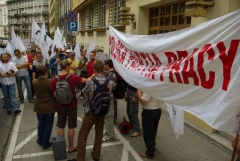 ![]() Protestujący mieli ze sobą transparent z hasłem: "Imperializm, grabież i zabijanie? To nie nasza tradycja! Nie nasze zobowiązanie!" oraz partyjne flagi. Solidaryzujemy się z czeskim społeczeństwem, które w większości jest przeciwne tarczy. To oni - obywatele - będą ponosić koszty jej budowy i ryzyko jakie za sobą niesie - mówił Florian Nowicki z PPP. Dodał, że mieszkańcy czeskiej miejscowości Trokavec i polskiego Redzikowa, gdzie mają być umieszczone elementy tarczy antyrakietowej, przeciwstawiają się jej budowie. Inny działacz partii Janusz Gańko mówił o zagrożeniach płynących z umieszczenia elementów tarczy antyrakietowej w Polsce podkreślając, że USA prowadzą imperialistyczną politykę co zwiększa zagrożenie terrorystyczne. Dodał, że partia domaga się przeprowadzenia referendum w tej sprawie i zebrała do tej pory 150 tysięcy podpisów. |