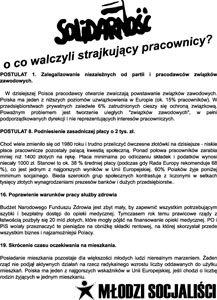 W swoich broszurach przypominali o wciąż aktualnych postulatach strajkujących latem 1980 roku takich jak prawo do swobodnego zrzeszania się w związkach zawodowych czy o lepszym dostępie do służby zdrowia. Młodzi Socjaliści nie zapomnieli też o żądaniach podwyżki płac i apelach o poprawę sytuacji mieszkaniowej Polek i Polaków.
