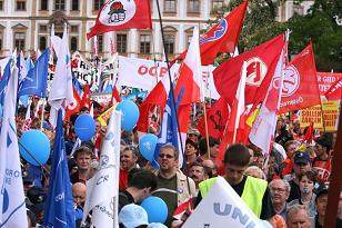 ![]() Hradèanské námìstí zosta³o zape³nione do ostatniego miejca. Nad t³umem manifestantów powiewa³y flagi 11 krajow. Przybyli zwi±zkowcy m.in. z Francji, Austrii, Niemiec, Chorwacji i S³owenii a tak¿e kilkusetosobowa grupa zwi±zkowców z Polski. Najliczniejsz± grupê zagraniczn± stanowili przedstawiciele polskiej "Solidarno¶ci". Byli obecni tak¿e cz³onkowie OPZZ. Demonstranci domagali siê paktu socjalnego dla Europy, zabezpieczenia miejsc pracy i regulacji miêdzynarodowych rynkow finansowych. Milan ©tìch, lider Konfederacji Zwi±zkowców Czech i Moraw (ÈMKOS), wezwa³ prezydenta Václava Klausa, rz±d Jana Fischera i deputowanych do tworzenia nowych miejsc pracy, zwiêkszenia inwestycji w o¶wiatê i s³u¿bê zdrowia oraz infrastrukturê. Zwi±zkowcy ostrzegli rz±dy krajow europejskich, by nie wykorzystywa³y kryzysu w celu zaostrzania warunków pracy, zbiorowych zwolnieñ i obni¿ek p³ac. Zwi±zowcy zgromadzili siê najpierw w praskiej dzielnicy Strahov, dok±d przyjecha³y setki autobusów z Czech i z zagranicy a potem przemaszerowali ulicami Pragi na miejsce manifestancji gdzie po³±czyli siê z kilkoma tysi±cami przedstawicieli Zwi±zku Zawodowego Nauczycieli. Demonstracjê zorganizowa³a Konfederacja Zwi±zkowców Czech i Moraw we wspó³pracy z Europejsk± Konfederacj± Zwi±zków Zawodowych (ETUC). |