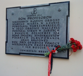 ![]() Pod tablicą zapalono znicze, złożono kwiaty przewiązane czerwoną i czarną wstążką oraz czerwono czarną flagę. 104 Kompania Związku Syndykalistów Polskich była jedną z głównych jednostek powstańczych walczących podczas Powstania Warszawskiego na Starym Mieście. Militarnie podlegała zgrupowaniu AK RÓG, politycznie pozostawała jednak niezależna. Jej żołnierze walczyli na przykład pod czarno czerwonym sztandarem i z opaskami takiego koloru, co było jedną z przyczyn konfliktów z dowództwem AK. Dom Profesorów to budynek na Starym Mieście będący główną pozycją bronioną przez 104 kompanię. Pomimo ciągłych ataków wroga została ona utrzymana aż do ewakuacji powstańców ze Starego Miasta. Członkowie LA złożyli jeszcze kwiaty w miejscu, gdzie znajdował się szpital polowy oddziału oraz pod gmachem Pałacu Krasińskich - niemieckiego punktu obrony, zdobytego 2 sierpnia 1944 roku przez syndykalistów. |