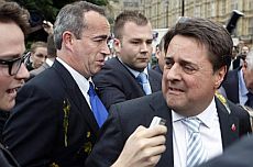 Na zdjęciu: Nick Griffin i jego koledzy zaatakowani jajkami przez antyfaszystów.