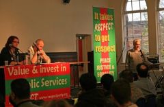 ![]() Konferencję otworzyła liderka partii Salma Yaqoob. W swoim przemówieniu skrytykowała ona Partię Pracy (Labour Party), uznając że to jej neoliberalna polityka przyczyniła się do wzrostu poparcia dla skrajnie prawicowej Brytyjskiej Partii Narodowej (British National Party) i wzrostu antymuzułmańskich nastrojów w brytyjskim społeczeństwie. Przypomniała m.in. krytyczne wypowiedzi Jack`a Straw`a na temat muzułmańskich kobiet noszących niqab, ataki ze strony byłej sekretarz stanu Ruth Kelly na największe organizacje muzułmańskie takie jak Muzułmańska Rada Brytanii (Muslim Council of Britain) i Muzułmańskie Stowarzyszenie Brytanii (Muslim Association of Britain) czy akcję Preventing Violent Extremism, uznaną za największą operację szpiegowską od czasów II Wojny Światowej. George Galloway w swoim wystąpieniu skoncentrował się na kwestii przyszłorocznej kampanii wyborczej do parlamentu. Zapowiedział, że wystartuje w nich jako kandydat RESPECT, a nie w koalicji z innymi organizacjami lewicy. Stwierdził, że tam gdzie będzie to możliwe RESPECT nawiąże jednak współprace z innymi partiami lewicy. Wezwał jednocześnie członków i sympatyków partii aby w miejscach gdzie zabraknie wiarygodnych lewicowych kandydatów głosować na Partię Pracy. Głos zabrali także m.in. Andrew Murray z Koalicji "Stop Wojnie" (Stop The War Coalition), który wezwał do wycofania brytyjskich wojsk z Afganistanu, Francisco Dominguez z Kampanii Solidarności z Wenezuelą (Venezuela Solidarity Campaign), który mówił o procesie rewolucji boliwariańskiej oraz Kevin Ovenden z Viva Palestina, który mówił o rozwoju ruchu solidarności z Palestyną. Odczytano list od Petera Cranie, kandydata Partii Zielonych Anglii i Walii (Green Party of England and Wales/Plaid Werdd Cymru a Lloegr) w wyborach do Parlamentu Europejskiego w okręgu North West, którego kampanię poparło RESPECT. W ostatnich wyborach zarówno Salma Yaqoob jak i George Galloway uznali, że poparcie dla Zielonych będzie najlepszą taktyczną opcją aby BNP nie zdobyło miejsc w Parlamencie Europejskim. Dziękuje wam za poparcie - napisał w liście. Wezwał on ponadto do budowy wspólnego antyrasistowskiego frontu lewicy, który uniemożliwi skrajnej prawicy ponowne zdobycie mandatów w wyborach do PE w 2014 roku. |
