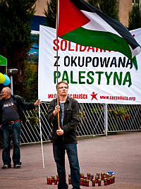 ![]() Podczas zgromadzenia Mateusz Mirys z Młodych Socjalistów mówił między innymi o konieczności okazania ostrego sprzeciwu wobec bestialskiej polityki władz Izraela, wezwał także rząd Donalda Tuska do stanowczej reakcji na naruszenie podstawowych zasad prawa międzynarodowego. Społeczność międzynarodowa ma już dość bezkarności polityków izraelskich decydujących o wieloletniej, nielegalnej i nieludzkiej blokadzie Strefy Gazy. Osoby odpowiedzialne za tę zbrodnie przeciwko ludzkości powinny zostać sprawiedliwe osądzone przed międzynarodowym trybunałem! - stwierdził Mirys. Dawid Dobrowolski przeczytał list Ewy Jasiewicz napisany do Donalda Tuska przed wyprawą. Odczytano także oświadczenie wydane przez Młodych Socjalistów w poniedziałek, wkrótce po pierwszych doniesieniach o szturmie na statki z pomocą humanitarną. W zorganizowanej w ciągu zaledwie kilku godzin demonstracji wzięło udział blisko 30 osób związanych m.in. z Młodymi Socjalistami, "Krytyką Polityczną", Kampanią Przeciw Homofobii, Amnesty International, ruchem anarchistycznym oraz kilku Palestyńczyków mieszkających w Łodzi. |