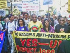 ![]() Jak powiedziała gazecie Sara Flounders z Międzynarodowego Centrum Akcji (International Action Center), które było jednym ze współorganizatorów manifestacji, w antyrasistowskim proteście uczestniczyli ludzie z różnych środowisk - organizacji lokalnych, różnego rodzaju grup religijnych, organizacji i partii politycznych, związków zawodowych, a także grup antywojennych i walczących o prawa człowieka. Wśród przemawiających na wiecu byli m.in.: Sayel Kayed z organizacji Amerykańscy Muzułmanie na rzecz Palestyny (American Muslims for Palestine), dr Asha A. Samad-Matias, reprezentująca Stowarzyszenie Somalijczyków Safrad (Safrad Somali Association) i Koalicję Kobiet Muzułmańskich (Muslim Women’s Coalition), Lucy Pagoda z Koalicji 1 Maja na rzecz Praw Robotników i Imigrantów (May 1st Coalition for Worker and Immigrant Rights) oraz Amadi Ajamu z Ruchu 12 Grudnia (December 12th Movement). Mówcy podkreślali, że głównym celem demonstracji jest wyrażenie solidarności i jedności ze społecznością muzułmańską w Stanach Zjednoczonych oraz ze wszystkimi siłami, które walczą z wszelkimi formami rasizmu i przeciwko imperialistycznym wojnom oraz popierają walkę o miejsca pracy, lepszą edukację i świadczenia społeczne. Na proteście widzieliśmy prawdziwy Nowy Jork - miasto robotników i ludzi o różnym kolorze skóry z całego świata. Ta mobilizacja zaczęła się dlatego, że musieliśmy bronić nasze muzułmańskie siostry i naszych muzułmańskich braci. Walka jednak będzie kontynuowana. Teraz musimy walczyć przeciwko wojnie, rasizmowi, o miejsca pracy, edukację i służbę zdrowia. Jest wiele takich spraw i teraz wiemy na kogo możemy liczyć - powiedział "WW" jeden z mówców Larry Holmes. Fot.: John Catalinotto/"Workers World". |