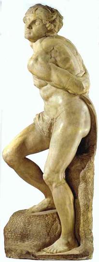 Następnie zwróćmy uwagę na rzeźbę zatytułowaną "Umierający jeniec", która znajduje się w Luwrze. Tytuł ten został nadany pośmiertnie, nie był pomysłem Michała Anioła. Samo dzieło nie zawiera żadnych nawiązań do tego, że mężczyzna jest jeńcem, czy niewolnikiem, chyba że w przenośnym seksualnym sensie jest "niewolnikiem miłości". Nie mówi nam też nic o tym, że jest umierający, chyba że w znaczeniu orgazmu - petite mort. Charles de Tolnay, ceniony specjalista od twórczości Michała Anioła, zauważa, że jest to "marzący młodzieniec, otrząsający się z więzów snu". Charles Sala, idąc podobnym tropem, spostrzegł, że "w zasadzie ta postać wcale nie umiera, jest raczej zanurzona w senności (...) gdzieś pomiędzy ospałą zmysłowością młodocianego efeba, a zadumą jeńca niezbyt przekonywująco okiełznanego."(8)