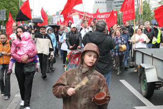 ![]() Demonstracja rozpoczęła się wiecem, podczas którego przemawiał Piotr Ikonowicz (KSS). Powiedział on, że najwyższy czas na tworzenie ruchu sprawiedliwości społecznej. Mówił również o toczących się walkach społecznych w kwestiach lokatorskich oraz pracowniczych. Przedstawił dotychczasową działalność KSS. Wśród przemawiających byli też działający w ramach KSS lokatorzy, którzy opowiedzieli o swojej sytuacji. Grzegorz Ilnicki opowiedział o działaniach KSS oraz związku zawodowego Konfederacja Pracy w trójmieście, gdzie w sieci sklepów Bell toczy się walka o prawa pracowników, po tym jak pracodawczyni zwolniła z pracy wszystkie członkinie związku. W Gdańsku, 10 proc. wszystkich pozwów kierowanych do sądu pracy przygotowuje punkt interwencyjno-prawny prowadzony przez KSS i OPZZ "KP". Przemawiał również Jarosław Niemiec z lubelskiej KSS, który nawiązał do dnia beatyfikacji Jana Pawła II, mówiąc, że politycy będą odgrywać tego dnia rolę wrażliwych społecznie, aby od razu wrócić do swoich zwyczajowych działań. Przytoczył również cytat jednego z brazylijskich biskupów, teoretyka teologii wyzwolenia - "gdy daję chleb biednym nazywają mnie świętym, gdy pytam się dlaczego nie mają chleba, nazywają mnie komunistą". Beata Karoń z KPP wspomniała o sytuacji ludzi młodych zmuszanych do pracy w ramach elastycznych form zatrudnienia. Dodała, że obecna wolność i demokracja to fikcja. Przemawiał również przedstawiciel mieszkających w Polsce Syryjczyków prosząc o wsparcie dla trwającej w tym kraju rewolucji. Zebrani przeszli głównymi ulicami Warszawy pod kamień upamiętniający walkę rewolucyjną bojowców Organizacji Bojowej PPS na pl. Grzybowskim. Podczas przemarszu skandowano "Nasze prawo - prawo pracy", "Dość wyzysku" oraz "Samorządność pracownicza". Pojawiły się również okrzyki "Syria - Warszawa, wspólna sprawa". Na kończącym demonstrację wiecu przemawiała Agata Nosal, która opowiedziała o bieżących działaniach KSS oraz konieczności zrzeszania się ludzi prześladowanych przez system. Uczestniczący w pochodzie dziennikarz, który robił reportaż o warunkach pracy na budowach opowiedział o sytuacji pracowników budowlanych zmuszanych do pracy między innymi w dniu 1 maja. Po pochodzie część jego uczestników udała się pod ambasadę syryjską na demonstrację solidarności z trwającą w tym kraju rewolucją. Syryjczycy przygotowali też dla wszystkich chętnych poczęstunek. |