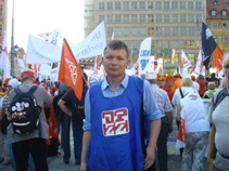![]() Manifestacja trwała od godziny 13.00 do 16.30 i początkowo brało w niej udział ponad 20 tysięcy osób (według szacunków policji - 15 tys.), a pod koniec, zdaniem związkowców 50 tys., zdaniem policji - 20 tys. Uczestnicy zebrali się na Polach Marsowych, przeszli obok Hali Stulecia, ulicą Marii Skłodowskiej-Curie, mostem Grunwaldzkim aż na Rynek. Znaleźli się wśród nich między innymi związkowcy z blisko trzydziestu organizacji, w tym sekretarz generalna EJZZ Bernadette Segol oraz liderzy OPZZ i NSZZ "Solidarność" - Jan Guz i Piotr Duda. Kolumnę maszerujących zamykali gospodarze: NSZZ "Solidarność" i OPZZ oraz związki zawodowe nienależące do EKZZ, np. NSZZ Policjantów. Choć politycy nie byli zapraszani i wyraźnie dano im do zrozumienie, że nie będą mogli przemawiać, niektórzy pojawili się, jak Grzegorz Napieralski, żeby "posłuchać ludzi", a inni, jak Michał Syska (na zdjęciu), aby dać wyraz swoim lewicowym i prozwiązkowym przekonaniom. Przewodniczący NSZZ "Solidarność" Piotr Duda powiedział na wrocławskim Rynku: Nie możemy pozwolić, aby walka z kryzysem była pretekstem do walki z i pracownikiem i człowiekiem. Nie możemy dopuścić, aby ci krwiopijcy patrzyli do cudzej kieszeni. Kieszeni pracownika i najuboższego (...) Spotkaliśmy się we Wrocławiu, aby zaprotestować i pokazać ministrom finansów, a tak właściwie krwiopijcom którzy doprowadzili do tego kryzysu, a teraz chcą nim zarządzać i mówić nam, co jest dla nas lepsze. Mieliśmy nadzieję, że wręczymy tym paniom i panom naszą petycję, ale uciekli ukradkiem jak szczury (...) Władza ma się nie bać obywateli, władza ma słuchać obywateli i wyciągać wnioski (...) Chcemy walki z kryzysem, ale poprzez rozwój, tworzenie miejsc bezpiecznej pracy. Chcemy pracowniczej Europy dla wszystkich obywateli. Europo pracownicza, obudź się! Przewodnicząca Segol także przemówiła po polsku: Jesteśmy tutaj aby nas usłyszeli ministrowie finansów. Mówimy "nie" polityce cięć budżetowych, mówimy "tak" polityce wzrostu zatrudnienia, mówimy "tak" europejskiej solidarności. Dodała, że Europa potrzebuje dialogu społecznego, a nie dla ataków na prawa pracownicze i ograniczania praw socjalnych. Próba odczytania petycji obradującym ministrom finansów UE nie powiodła się, gdyż ci zakończyli obrady przed planowanym terminem. Duda skomentował to: Maszerujemy, by pokazać obradującym we Wrocławiu ministrom finansów, których ja nazywam krwiopijcami, że to oni i ich polityka , a nie zwykli robotnicy, odpowiadają za ten kryzys. Uciekli przed nami jak szczury. Manifestacja odbywała się w nieagresywnej atmosferze, czego bardzo chcieli organizatorzy. Warto jednak zaznaczyć, że na Polach Marsowych oprócz związkowych służb porządkowych pracowali ochroniarze z wynajętej agencji, policjanci i strażnicy miejscy na koniach. Sam przemarsz odbył się spokojnie, choć chwilami dosyć hałaśliwie, gdyż demonstranci używali petard hukowych, trąbek i gwizdków. |