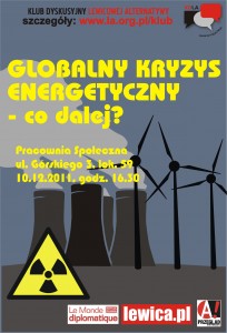 ![]() Globalizacja oraz wysoki uprzemysłowienie doprowadziły świat do sytuacji, w której mamy do czynienia z niedoborem energii. Świat staje przed problemem, w jaki sposób szybko i tanio wyprodukować dużą ilość energii. Zauważalna jest również ogólna tendencja odchodzenia od energii pochodzącej ze spalania paliw kopalnych, a w szczególności węgla. Co może stanowić alternatywę dla węgla? Czy taką alternatywę stanowi energia pozyskana przy pomocy elektrowni atomowych? Czy wizja awarii w takiej elektrowni może odstraszyć ludzkość od angażowania się w rozwój energetyki jądrowej? W jaki sposób to, co wydarzyło się w Czarnobylu oraz Fukuszimie może wpłynąć na rezygnację z energii atomowej na rzecz zielonej energii. Jaki sposób wytwarzania energii jest tak naprawdę przyjazny dla środowiska. Czy w ogóle możemy mówić o alternatywnych źródłach energii. A może czas najwyższy zastanowić się nad koniecznością oszczędzania energii. Gdzie i w jaki sposób oszczędzać energię? Na te i na wiele innych pytań postaramy się odpowiedzieć wspólnie na spotkaniu. Patronat Medialny nad KDLA objęły: portal Lewica.pl, "Le Monde Diplomatique - edycja polska" oraz "Przegląd Anarchistyczny". Wiecej o spotkaniu na stronie Klubu. |