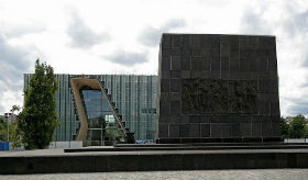 Zdjęcie: Pomnik Bohaterów Getta w Warszawie. W tle gmach Muzeum Historii Żydów Polskich.