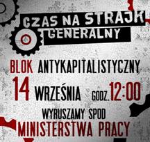 Organizacje społeczne i radykalnie lewicowe zdecydowały o zorganizowaniu bloku antykapitalistycznego, który będzie uczestniczył w demonstracji związkowej 14 września w Warszawie. Uważamy, że konieczna jest szeroka koalicja wszystkich środowisk, które sprzeciwiają się polityce rządu pod dyktando kapitału. Chcemy wspólnie opracować strategię postępowania i formę uczestnictwa w protestach społecznych. czytamy we wspólnym oświadczeniu różnych organizacji.