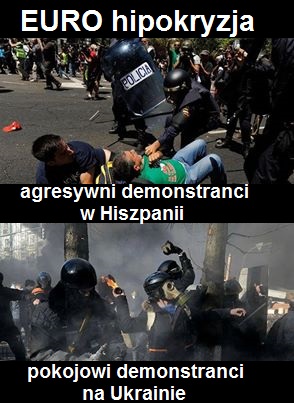 Co słychać z kolei w polskich mediach przy okazji walk na Ukrainie? Pierwsze starcia tłumaczono udziałem „tituszków”, czyli opłaconych przez władze prowokatorów. TVN24 i TVN pokazywały wprawdzie uzbrojonych w kije i widły „pokojowych” demonstrantów na Majdanie w Kijowie, ale wyjaśniając, że to jedynie w celu obrony przed prowokatorami. Podobnie wyjaśniano formowanie oddziałów samoobrony, paramilitarnych grup szkolących się w walce wręcz, niszczeniu sprzętu wojskowego oraz rzucaniu koktajlami Mołotowa. Uwagi polskich mediów nie zwrócił fakt, że podczas pokojowego protestu nie organizuje się manufaktur koktajli Mołotowa, ani nie gromadzi ciężkiego sprzętu budowlanego pomagającego wznosić barykady. Coś takiego jest wyraźnym znakiem długotrwałych przygotowań do zamachu stanu.