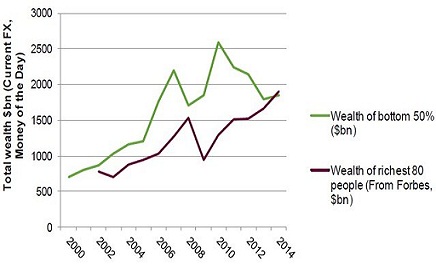 Jeszcze szybciej w ciągu ostatnich lat akumulowali bogactwo miliarderzy obecni na liście magazynu „Forbes”. W 2010 roku majętność netto 80 najbogatszych ludzi wynosiła 1,3 biliona dolarów, a cztery lata później – już 1,9 biliona, a więc wzrosła nominalnie o połową. Inaczej sprawa miała się z majętnością biedniejszej połowy mieszkańców Ziemi. O ile w latach 2002-2010 rosła ona mniej więcej tak samo, jak miliarderów, o tyle począwszy od 2010 roku – malała. Obecnie 3,5 miliarda najbiedniejszych ludzi posiada tyle, ile 80 najbogatszych. Jeszcze w 2010 roku potrzeba było aż 388 miliarderów, aby dorównać biedniejszej połowie populacji.