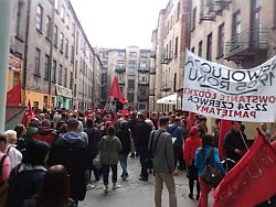 Druga część uroczystości odbyła się wieczorem w centrum miasta. Spod tablicy upamiętniającej walki na barykadach, znajdującej się na ul. 1905 roku kilkuset zebranych przeszło na ul. Piotrkowską. Towarzyszyły im występy Krakowskiego Chóru Rewolucyjnego oraz teatru ulicznego. W pochodzie wzięli udział członkowie Krytyki Politycznej, RSS, OZZ IP, Razem oraz Komunistycznej Partii Polski.