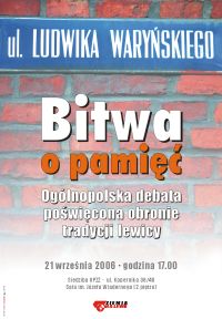 ![]() W debacie, do której dojdzie w przededniu 150. rocznicy urodzin Ludwika Waryńskiego, wezmą udział osoby zaangażowane w obronę tradycji i miejsc pamięci lewicy; przedstawiciele inicjatyw obywatelskich, stowarzyszeń, ugrupowań politycznych. W dyskusji wystąpią m.in.: Piotr Ciszewski, prof. Krzysztof Dunin-Wąsowicz, Marian Indelak, dr Łukasz Jastrząb, prof. Ryszard Nazarewicz, Paweł Pawlak, Piotr Skura, prof. Andrzej Werblan, Olimpia Zaborska oraz Piotr Zawrotniak. Debatę poprowadzi: red. Leszek Lachowiecki Patronat medialny nad debatą objęły lewica.pl oraz "Nowy Tygodnik Popularny". Z okazji konferencji jej organizatorzy wydali oświadczenie zaatytułowanew Przełamiemy monopol prawicy na historię! którym czytamy: Na murze warszawskiej Cytadeli sąsiadują tablice upamiętniające powieszonych przywódców powstania styczniowego i działaczy partii Proletariat. Dziś ceni się jedynie bohaterów sprawy narodowej, wymazując z pamięci tych, którzy walczyli o ideały społeczne. Organizatorzy konferencji podkreślają, że rządząca Polską partia zapowiada dekomunizację nie tylko ludzi, ale także symboli w związku z czym bardzo realna jest groźba przepisywania podręczników do historii, niszczenia miejsc pamięci lewicy, zmian nazw placów, ulic i instytucji. W przededniu 150 rocznicy urodzin Ludwika Waryńskiego mówimy: dość! Dość pomiatania historią i tradycjami polskiego ruchu robotniczego. Dość poniżania i deptania godności tych, którym walka o wolną i niepodległą Polskę nie wystarczała i dlatego walczyli także o Polskę sprawiedliwą, ludową, wolną od feudalnego i kapitalistycznego ucisku - dodają organizatorzy konferencji. W oświadczeniu wezwano ponadto do stworzenia szerokiego frontu społecznego, którego celem byłoby obrona tradycji i symboli lewicy. |