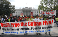 ![]() Marsz swój poczatek miał przed budynkiem Departamentu Sprawiedliwości stanu Pennsylwania, który odmówił zaklasyfikowania Carrilesa jako terrorysty. Protestujący wznosili przed budynkiem okrzyki "Uwięzić Carrilesa - Uwolnić Piątkę!". Następnie demonstranci przenieśli się do stolicy USA, Waszyngtonu, aby pikietować na jego głównej ulicy Pennsylvania Avenue, przy której mieści się Biały Dom. Jeden z inicjatorów marszu Andres Gomez, przed wyruszeniem pod siedzibę amerykańskiego prezydenta, przeczytał zgromadzonym nazwiska 73 osób, które zginęły w 1976 w ataku terrorystycznym na samolot kubańskich linii lotniczych, którego dokonał Carriles. Wspomniał również o chilijskim ministrze spraw zagranicznych Orlando Letelierze oraz jego asystencie Ronnim Mofficie, zabitym za cichym przyzwoleniem władz USA przez agentów Augusto Pinocheta, a także o zamordowanym w 1979 w Portoryko przez tamtejszą policję, opłacaną przez prawicowych kubańskich terrorystów Carlosie Muñizie Varelu. W marszu brał udział syn Orlando Leteliera, Francisco Letelier, który oskarżył rząd USA o sprzyjanie terrorystom i ukrywanie prawdy. Powiedział on również, że po 30 latach od zamachu na jego ojca, wszyscy doskonale wiedzą że dokonał go Carriles z inspiracji Białego Domu. Jeden z demonstrantów Livio Di Celmo powiedział do zgromadzonych: To było 4 września 1997, kiedy odebrałem telefon z Hawany od mojego ojca. Powiedział mi że mój brat zginął od bomby. Mój brat był najemnikiem, któremu płacono 5000 USD w zamian za podłożenie jednego ładunku na terytorium Kuby. Jego mocodawcą był terrorysta Carriles. Mój brat, Fabio, siedział obok bomby która niespodziewanie wybuchła. Mój brat wykrwawił się na śmierć. Z czasem zacząłem odkrywać, że w wyniku terrorystycznej działalności skrajnie prawicowych emigrantów kubańskich z Miami, życie straciło ponad 3400 Kubańczyków na wyspie. Gdy dowiedziałem się o uwięzieniu piątki moich braci z Kuby, pierwszą rzeczą jaką zrobiłem było zgłoszenie akcesu do organizacji walczącej o ich uwolnienie z rąk amerykańskiego wymiaru sprawiedliwości, chciałem w ten sposób wyrazić swoje poparcie dla nich. Kubańska piątka, Gerardo Hernández, Ramón Labañino, Antonio Guerrero, Fernando González i René González, zostali uznani w 2001 przez amerykańskie sądy za "groźnych terrorystów" i skazani na kary, od podwójnego dożywocia do 15 lat pozbawienia wolności. |
