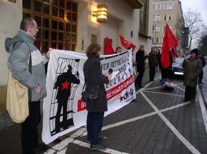 ![]() Beata Karoń z KPP odczytała uchwałę Światowej Federacji Młodzieży Demokratycznej, solidaryzującą się z KSM. Pikietujący wręczyli przedstawicielom ambasady petycję przeciwko delegalizacji KSM. Antykapitaliści nie dadzą się zepchnąć do podziemia – mówił Piotr Ikonowicz z NL. Dodał, że uprawiany przez oficjalną propagandę zabieg sprowadzania komunizmu do stalinizmu jest absurdalny. Aby demonstrować w obronie KSM nie trzeba zgadzać się z tą organizacją. Atak na nią jest przecież atakiem na całą lewicę sprzeciwiającą się kapitalizmowi – powiedział Piotr Ciszewski z CK-LA. Stwierdził również że każde represje są złem, nieważne w jakim kraju mają miejsce. Działacze CK-LA trzymali transparent "Żadnych represji za działalność społeczną, solidarność naszą bronią". Podobne demonstracje odbyły się 13 grudnia, który został ogłoszony przez Światową Federację Młodzieży Demokratycznej międzynarodowym dniem solidarności z KSM, także w innych krajach na całym świecie. |