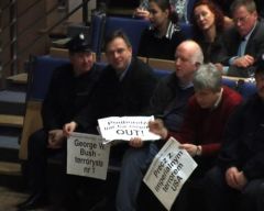 Jak można się spodziewać, na spotkanie z neokonserwatywną ikoną przyszło wielu jego przeciwników: studentów, wykładowców, liderów radykalnej lewicy. Część z nich trzymała kartki krytyczne wobec mówców (np. "Podhoretz - liar for empire OUT!"), kilka osób komentowało docinkami wypowiedzi prelegentów. Straż uniwersytecka wyprowadziła kilka z tych osób.