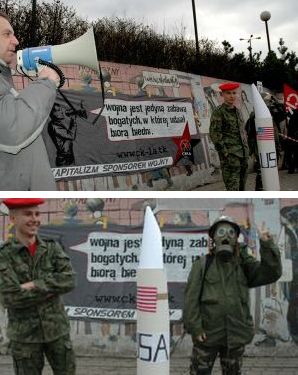 ![]() W centrum miasta stanęła makieta amerykańskiej rakiety którą ochraniało dwóch działaczy CK-LA przebranych za żołnierzy, krzyczacych do zebranych "military area - keep out!" i grożących nieposłusznym wysłaniem do Guantanamo. Teren wokół rakiety ogrodzono i ogłoszono eksterytorialną strefą wojskową US Army. Odczytano również list George`a W. Busha do polskich sojuszników, mówiący miedzy innymi: Nie wszyscy są tacy OK, jak Wy, co nie tylko nie przeszkadzacie w naszej misji, ale jeszcze pomożecie, jak trzeba dowalić jakiemuś krajowi, albo potrzymać bez sądu jakiegoś łobuza i go trochę przycisnąć, dać po łbie, albo pokłuć szpilkami, żeby wyśpiewał kto jeszcze nie kocha Ameryki, oraz: Tak więc - Polscy Przyjaciele - plan jest taki. Robimy u Was bazy naszego wojska - to młode fajne chłopaki co to i wypić lubią i się pobawić, więc będzie robota i dla pań i dla panów. Aby nie zawracać głowy Waszym sądom, jak nasi żołnierze trochę pobrykają, to umawiamy się, że te bazy są poza waszym terytorium i tubylcom wstęp wzbroniony - jak w Guantanamo. W tych miejscach instalujemy te rakiety, co będą strącać rakiety tamtym, co ich nie lubimy. Już niedługo takie bazy moga znaleźć się w naszym kraju. Po co wydawać pieniądze na szpitale, szkoły czy żłobki. Nasi rządzący znaleźli już sposób na rozwój polskiej gospodarki - militaryzm - stwierdził w swoim wystąpieniu Andrzej Smosarski. Każdy może być terrorystą! Niebezpieczeństwo czai sie wszędzie! Musimy pozwolić amerykańskim chłopcom przybyć do Polski, aby bronili nas przed takimi naszymi odwiecznymi wrogami jak Iran i Korea - dodał ironicznie. Naszym happeningiem chcemy nakłonić Państwa do zabrania głosu w sprawie baz, niepozwolenia aby rządzący podjęli decyzje ponad naszymi głowami - mówił Smosarski do przechodniów. Działacze Federacji Anarchistycznej zbierali na happeningu podpisy pod petycją przeciwko instalowaniu w Polsce tarczy antyrakietowej. |