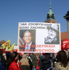 ![]() W manifestacji brali udział m.in. działacze Polskiej Partii Pracy, Wolnego Związku Zawodowego "Sierpień 80", Nowej Lewicy, Młodych Socjalistów, Pracowniczej Demokracji, ATTAC, Komunistycznej Partii Polski, Polskiej Partii Socjalistycznej, RACJI Polskiej Lewicy, Unii Pracy, Zielonych 2004, Grupy na rzecz Partii Robotniczej, Stowarzyszenia Irakijczyków w Polsce, Czerwonego Kolektywu-Lewicowej Alternatywy i Federacji Anarchistycznej. Wznoszono okrzyki: "Żadnej krwi za ropę", "Wyrzutnia dla rządu nie dla rakiet", "USA imperium zła", "Wojna klasowa, nie narodowa", "Trzy miliony nowych domów, nie jankeskich poligonów", "Jankesi do domu", "W Iraku, w Iranie, skończycie jak w Wietnamie", "Wojna, terror, dwa bliźniaki" oraz "Znajdzie się kij na Kaczora ryj". Uczestnicy demonstracji trzymali transparenty z napisami m.in.: "Dość lobbingu i imperializmu USA" (RACJA PL), "Wojna jest jedyną zabawą bogatych, w której udział biorą biedni" (CK-LA), "Nie chcemy umierać za USA" (NL) oraz "Świat dla ludzi, nie dla Busha" (ISW). Bogusław Ziętek z Polskiej Partii Pracy w swoim wystąpieniu skrytykował hipokryzję SLD, które najpierw wysłało wojska do Iraku, a teraz stara się uciec od odpowiedzialności. Od czterech lat protestuję przeciwko okupacji wojsk amerykańskich w moim kraju. Amerykanie od czterech lat mordują Irakijczyków. Wystarczy tej wojny. Wojska amerykańskie i ich sojusznicy - którymi są też Polacy - powinny jak najszybciej wycofać się z Iraku powiedział mieszkający w Polsce Irakijczyk Bahjat Suliman Panie Bush, to pan jest mordercą i kłamcą! - dodał, zwracając sie w kierunku ambasady USA. Odczuwam wielki wstyd w zwiazku z tym, że Polska bierze udział w okupacji Iraku - stwierdził Maciej Wieczorkowski z Inicjatywy "Stop Wojnie". Jeśli rząd ma zamiar przeprowadzić referendum w sprawie autostrady przez dolinę Rospudy, to tym bardziej powinien przeprowadzić je w sprawie rozmieszczenia w Polsce tarczy antyrakietowej - mówił Piotr Ikonowicz z Nowej Lewicy. Gdzie są dziś ci wszyscy dyżurni moralisci walczący o "demokrację" i prawa człowieka. Dlaczego walczą o prawa człowieka na Białorusi, a jednocześnie nie przejmują się ich o wiele poważniejszym łamaniem w Iraku - powiedział Piotr Ciszewski z CK-LA. Manifestanci zebrali się na Placu Zamkowym, skąd przeszli przed Pałac Prezydencki i ambasadę USA. W obu tych miejscach zorganizowano happeningi. Pałac został "ostrzelany" gumowymi i pluszowymi kaczkami, w stronę ambasady rzucano jajka i kartonowe rakiety. |