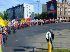 ![]() Demonstrację zorganizował Komitet Pomocy i Obrony Represjonowanych Pracowników oraz Ogólnopolski Związek Zawodowy Inicjatywa Pracownicza. Wzięli w niej udział działacze wielu organizacji, między innymi OZZ IP, WZZ "Sierpień 80", Czerwonego Kolektywu-Lewicowej Alternatywy, Warszawskiej Grupy Anarchistycznej, Polskiej Partii Pracy, Nowej Lewicy, Komunistycznej Partii Polski, Komunistycznej Młodzieży Polski, Młodych Socjalistów, stowarzyszenia ATTAC i Stowarzyszenia Lepszy Świat. Demonstranci przynieśli transparenty "Kto sieje nędzę, ten zbiera gniew" (anarchiści), "Dość łamania praw pracowniczych" (OZZ IP), "Praca czasowa, dyskryminacja stała" (CK-LA), "Bezdomność, bezrobocie, wypadki przy pracy. Kapitalizm zabija" (CK-LA) i "Zakłady w ręce ludzi pracy" (KMP). W Polsce wciąż istnieją niewolnicy - powiedział lider PPP i WZZ "Sierpień 80" Bogusław Ziętek, dziś ci niewolnicy mówią dość! - dodał. Podkreślił również, że IMPEL jest sztandarowym przykładem stosowania wobec pracowników najgorszych praktyk. Jarosław Urbański z OZZ IP przypomniał, że w 2002 roku to ochroniarze z IMPELu rozbili pokojowy protest pracowników Fabryki Kabli Ozarów. Jego przemówienie zakończyły okrzyki "Pamiętamy wam Ozarów!" Jacek Rosołowski (OZZ IP, NL) były pracownik IMPELu powiedział, że wygrał proces z firmą przed sądem pracy, ale w odwecie zwolniono czterech jego kolegów, którzy potwierdzili łamanie prawa pracy przez kierownictwo. Gdy demonstracja ruszyła w stronę, otoczonego metalowymi barierkami, budynku firmy, poleciało kilka petard. Związkowcy z WZZ "Sierpień 80" zostawili szefostwu IMPELu taczkę oraz raport o łamaniu praw pracowniczych. Demonstrujący przeszli do centrum miasta, skandując "Nasze prawo - prawo pracy!" i "Jedność klasy robotniczej!". Demonstracja zakończyła się wiecem na wrocławskim rynku. Przedstawiciele demonstrujących chcieli zostawić w biurze posłów PiS raport dotyczacy łamania praw pracowniczych przez IMPEL oraz przygotowaną przez WZZ "Sierpień 80" i OZZ IP propozycję ustawy o zatrudnieniu czasowym. Okazało się jednak, że biuro było zamknięte. Związkowcy zapowiedzieli, że oba dokumenty zostaną przesłane posłom. |