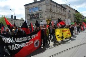 ![]() Demonstrujący nieśli transparenty "Dość łamania praw pracowniczych" (OZZ IP), "Wyzysk w miejscu pracy albo nędza na bezrobociu - twój wybór w kapitalizmie" (CK-LA) "Kapitalizm zabija" (CK-LA) "Praca czasowa, dyskryminacja stała" (CK-LA), "Zakłady w rece pracowników" (KMP). Wznoszono okrzyki "Nasze prawo - prawo pracy" i "Kapitalizm - kanibalizm". Demonstracja zakończyła się wiecem pod pomnikiem upamiętniającym wystąpienia robotnicze 1956 roku. Marcel Szary z OZZ IP w zakładach Cegielskiego powiedział, że pochód pierwszomajowy jest częścią walki pracowników fabryki i że nadal będą oni walczyć o podwyżki i poprawę warunków pracy. Jakub Grzegorczyk z CK-LA zwrócił uwagę na to, iż przy okazji Święta Pracy powinno się pamiętać o pracownikach czasowych, którzy są najbardziej prześladowaną grupą. Wieczorem na poznańskim skłocie Rozbrat odbyło się spotkanie z Rafałem Górskim, autorem publikacji o demokracji uczestniczącej i budżecie partycypacyjnym. Rozpoczęły się również targi niezależnych wydawnictw oraz VI Ogólnopolska Konferencja Pracownicza, w ramach której odbyły się miedzy innymi dyskusje o cyklicznym charakterze protestów pracowniczych oraz szukaniu nowych sposobów organizowania środowisk pracowniczych. |