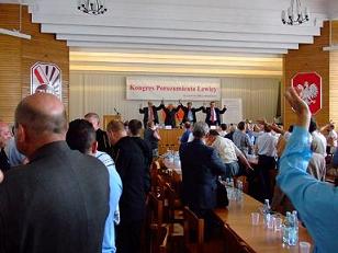 ![]() W kongresie wzięło udział także wielu obserwatorów ze związków zawodowych. Bogusław Ziętek z PPP w swoim przemówieniu zdecydowanie jeszcze raz zapewnił, że Polska Partia Pracy nie ma zamiaru brać udziału w żadnych koalicjach z LiD-em, ani blokować wraz z nim list wyborczych, bo doprowadziłoby to, jego zdaniem, jedynie do wyniesienia do władzy skrajnie antyspołecznej Platformy Obywatelskiej i Demokratów. Zdementował także pojawiające się w prasie spekulacje na ten temat. PPP nie ma nic wspólnego z liberalnym LiD-em. LiD sytuuje się w centrum polskiej sceny politycznej, ale w Polsce jest wystarczająco dużo ludzi, poniżonych i wyzyskiwanych, którzy poszukują swojej reprezentacji. Tym ludziom właśnie chcemy służyć i ich reprezentować. Dziś większość społeczeństwa, 60 proc. ludzi, którzy nie chodzą do wyborów, nie ma swojej reprezentacji. To są ludzie, którzy z nadzieją patrzą na to co my robimy. Mam nadzieję, że tej nadziei nie zmarnujemy. Tak długo jak wiara ta będzie w nas trwała, my - jako Polska Partia Pracy - konsekwentnie i rzetelnie, będziemy budować wspólnie z Wami Porozumienie Lewicy - dodał. Podkreślał, że rolę nowej formacji widzi w służeniu ruchowi związkowemu i całemu ruchowi pracowniczemu. Dodał, że nie chodzi o to by związki zawodowe były klientem tej formacji, ale by to ona im służyła. Bogusław Gorski z Polskiej Partii Socjalistycznej powiedział, że jego partia też nie ma zamiaru wchodzić w jakiekolwiek układy z neoliberalnym LiD-em i widzi ona swe miejsce w nowej prawdziwie lewicowej formacji. Jan Barański z RACJI zwrócił z kolei uwagę, że z LiD-em dzielą uczestników kongresu także różnice światopoglądowe. Podczas gdy LiD twierdzi, że należy bronić świeckości państwa, to my uważamy, że o tą świeckość trzeba walczyć, bo dawno jej już w Polsce nie ma - stwierdził. Jako gość zabrał głos Marek Dyduch przewodniczący Platformy Socjalistycznej w SLD. Wyraził swoje zadowolenie, że na lewicy powstaje lewicowe ugrupowanie nieskażone parlamentarną działalnością tak jak jest to w przypadku SLD. Przeprosił za SLD stwierdzając, że przez wszystkie te lata odchodziło ono od lewicowych ideałów i nie realizowało obietnic, które składało w kolejnych wyborach. Zapewnił, że w dołach jego partii są tysiące ludzi, którzy myślą w podobny sposób, co uczestnicy Kongresu i lewica nie może ich stracić. Mówił o błędach jego ugrupowania, które pcha się do centrum sceny politycznej, w którym jest aż ciasno od różnych partii i bardzo trudno znaleźć tam własne miejsce. Dodał, że on i jego platforma uważają, że jedyne miejsce dla SLD to lewa strona sceny politycznej. Jedna z delegatek Polskiej Partii Pracy podniosła w swej wypowiedzi potrzebę budowy instytutu lewicowej myśli społeczno-ekonomicznej. Kongres przyjął deklarację ideową oraz podjął szereg uchwał, m.in. o poparciu dla protestujących pielęgniarek i uchwała potępiająca pomysł instalacji w Polsce amerykańskich baz rakietowych. |