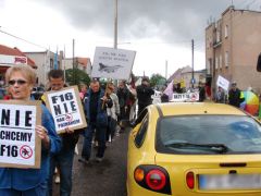 ![]() Manifestanci skandowali hasła: "Nie dla F-16", "F-16 albo my". Nieśli transparenty z napisami: "Teren skażony potwornym hałasem", "Hałas zabija" czy "Pilotom działki tanio sprzedam". Daty protestu nie wybrano przypadkowo. Tego dnia trwał tam Festyn Lotniczy, którego głównym punktem był pokaz grupy reprezentacyjnej sił powietrznych USA Thunderbirds, latającej na samolotach F-16. Demonstrację zorganizowały Stowarzyszenie Ekologiczne Marlewo oraz Poznańska Koalicja Antywojenna. |