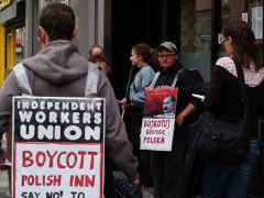 ![]() Większość uczestników pikiety stanowili znajomi 21-letniej Marty, która w restauracji przepracowała 10 godzin. Po skończonej pracy szef poinformował ją, że zadzwoni za kilka dni. Nie zadzwonił, a za pracę nie zapłacił. W sprawę zaangażował się Niezależny Związek Robotników (Independent Workers Union), którego przedstawiciel zażądał od szefów restauracji uregulowania należności za wykonaną pracę. Właścicielka "Gospody Polskiej" na początku twierdziła, iż dziewczyna nigdy u niej nie pracowała, a następnie zaproponowała Marcie 50 euro. Później zlekceważyła jednak całkowicie sprawę. Jak się okazało Marta nie była pierwszą osobą potraktowaną w ten sposób, a proceder wykorzystywania pracowników pod pretekstem "próbnego dnia" nie jest wyłącznie domeną polskiej restauracji. Sama akcja wywołała spontaniczne reakcje przechodniów, którzy aktywnie popierali protestujących. Jedna z przechodzących kobiet weszła oburzona do lokalu i wymachując pięścią wołała w kierunku kierownictwa "Irlandia nie jest krajem niewolników!". Protestujący rozdawali ulotki po polsku i angielsku. Już po kilkunastu minutach akcji, kierowniczka "Gospody Polskiej" zapewniła, że w ciągu kilku dni zapłaci całą należność. Wezwana przez nią policja (Garda) nie znalazła powodu do interwencji. |