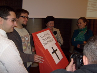 ![]() Członkowie młodzieżówki SdPl nawiązali w ten sposób do słów Gronkiewicz-Waltz, wypowiedzianych w jednym z wywiadów prasowych, w którym przekonywała, że radni, w tym także ona sama, mają jako katolicy prawo do publicznego manifestowania swojej religijności w samorządzie lokalnym. Członkowie SMS zaproponowali więc prezydent, aby wygodny fotel, na którym zasiada podczas sesji rady miasta, zastąpiła klęcznikiem i w ten sposób wyrażała swoją wiarę jasno i publicznie. Hanna Gronkiewicz-Waltz prezent przyjęła. Stowarzyszenie Młoda Socjaldemokracja po raz kolejny zaprotestowało przeciw umieszczeniu w statucie miasta preambuły z odwołaniem do Boga. W opinii SMS zapis preambuły, jest kolejnym krokiem ku ideologizacji każdej dziedziny życia, budowania w Warszawie i w całej Polsce państwa wyznaniowego, opartego jedynie słusznej religii. |