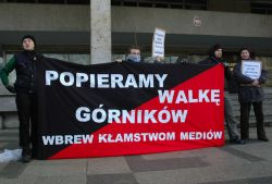 ![]() Warszawa Pikieta pod budynkiem Ministerstwa Gospodarki zgromadziła około 50 osób. Znaleźli się wśród nich przedstawiciele Wolnego Związku Zawodowego "Sierpień 80" z Tramwajów Warszawskich. Pikietę wsparli też działacze Grupy na rzecz Partii Robotniczej, Czerwonego Kolektywu-Lewicowej Alternatywy, Pracowniczej Demokracji oraz Federacji Anarchistycznej. Działacze CK-LA rozwinęli transparent "Wyzysk w miejscu pracy lub nędza na bezrobociu - twój wybór w kapitalizmie. Samorządność pracownicza zamiast dyktatury rynku". Wznoszono okrzyki "Budryk Warszawa, wspólna sprawa" oraz "Solidarność ludzi pracy". Przedstawicielka WZZ "Sierpień 80" z Tramwajów Warszawskich mówiła, że ruch związkowy musi działać razem, a górnicy pokazują jak należy walczyć o swoje prawa. Andrzej Żebrowski z PD mówił, że nie jest prawdą iż aby dać górnikom równe płace za równą pracę trzeba zabrać innym grupom zawodowym. Przypomniał o nieproporcjonalnie wysokich zarobkach menadżerów zarządzających Jastrzębską Spółką Węglową, do której należy KWK "Budryk". Wojciech Orowiecki z GPR stwierdził, że należy przeciwstawić się działaniom propagandy mającej na celu skłócenie różnych grup zawodowych. Przedstawicielka środowisk feministycznych odczytała oświadczenie podpisane przez kilka organizacji feministycznych, wyrażające poparcie dla strajkujących górników. Poznań Około 20 osób w tym przedstawiciele zakładów Cegielskiego i Goplany, Komisji Środowiskowej Inicjatywy Pracowniczej i Federacji Anarchistyczne s. Poznań wzięło udział w pikiecie pod Urzędem Wojewódzkim w Poznaniu. Akcja zaczęła się o godz. 12.00. w momencie rozpoczęcia demonstracji pod kopalnią "Budryk". Protestujący w Poznaniu skierowali do wojewody pismo domagające się od rządu podjęcia kroków celem spełnienia słusznych postulatów górników. Akcji towarzyszyło dość spore zainteresowanie mediów. Transparent protestujących głosił: "Popieramy walkę górników - wbrew kłamstwom mediów" (na zdj.). |