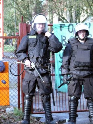 ![]() Zatrzymanie i oskarżenia wobec uczestników demonstracji przeciwko budowie elementów amerykańskiej tarczy antyrakietowej, Słupsk 29-30 marca 2008 r. Anarchistyczny Czarny Krzyż - Poznań Demonstracja 29 marca w Słupsku zaplanowana została demonstracja przeciwko budowie elementów amerykańskiej tarczy antyrakietowej (więcej o powodach zorganizowania protestu można dowiedzieć się ze stron: www.tarcza.org i www.m29.bzzz.net). Przed demonstracją zgromadzone zostały duże siły policyjne. Funkcjonariusze już kilka dni wcześniej nachodzili organizatorów protestu wypytując o szczegóły protestu i próbując ich zastraszyć. Podczas samego protestu, który zgromadził według różnych szacunków od 500-800 osób, policja zachowywała się raczej nie konfrontacyjnie. Oddziały prewencji nie były widoczne, dzięki czemu demonstracja przebiegała spokojnie. W miejscu wiecu ustawiony został wóz monitoringu policyjnego służący do obserwowania i nagrywania wydarzeń w miejscach publicznych. Sytuacja stała się bardziej nerwowa podczas przejścia części demonstrantów (ok 100-200 osób) w stronę lotniska w Redzikowie pod Słupskiem. Nad maszerującymi pojawił się policyjny helikopter, a dookoła nie oznakowane wozy policyjne. Po dojściu demonstrantów pod boczne wejście lotniska, ok. godz. 15.30, oddziały prewencji z tarczami odepchnęły protestujących próbujących wejść na jego teren. Demonstranci przeszli wówczas pod bramę główną. Oddziały policji tam zgromadzone użyły pałek i psów w celu odepchnięcia protestujących. Do większych starć jednak nie doszło. Policja zatrzymała jednak dwóch manifestantów, którzy zostali wypuszczeni po kilku godzinach. Już po zakończeniu protestu, ok godz. 17.15, przy ul. Tuwima w Słupsku, jednego z jego uczestników zatrzymała policja. Jak pretekst zatrzymania podano trzymane przez niego piwo. Został on ukarany mandatem w wysokości 650 zł "za zaśmiecanie i spożywanie alkoholu w miejscu publicznym". Jako część wydarzeń związanych z protestem przeciwko tzw. "tarczy antyrakietowej" zaplanowana została impreza muzyczno-taneczna w jednym z Słupskich pubów (klub "Keller"). Impreza trwała do wczesnych godzin rannych w niedzielę. Dwie osoby uczestniczące w imprezie zostały rozpoznane później jako policjanci w cywilu. Uczestnicy imprezy byli również fotografowani przez policjantów z nie oznakowanego wozu zaparkowanego po drugiej stronie ulicy. Ten sam wóz widziany był potem, gdy śledził grupę 25 osób, które po zakończonej potańcówce udały się do mieszkania przy ul. Bogusława X, gdzie znajdował się nocleg dla demonstrantów przybyłych z innych miast. Cała grupa dotarła do mieszkania ok. godz. 4.30 nad ranem. Napaść policji Około godziny 5.40 u drzwi mieszkania przy ul. Bogusława X zjawiła się policja. Znajdowało się w nim wówczas 25 osób. Według ich relacji odmówiono wpuszczenia policji do mieszkania, ponieważ nie mogli się oni wylegitymować żadnym nakazem. Kiedy policja nalegała, na klatkę schodową wyszedł właściciel mieszkania. W czasie rozmowy zaproponował, że jeden z policjantów może wejść do środka, żeby mógł zobaczyć, że wszystko jest w porządku. Od funkcjonariusz policji usłyszeli jednak: "Co ty mi tu pierdolisz, kto ma wchodzić, kto nie!". Odciągnięto go od drzwi, przewrócono na ziemię i złożono kajdanki. Pozostali w mieszkaniu próbowali zamknąć ponownie drzwi, które jeden z policjantów zablokowała wkładając pałkę w szparę. Do mieszkania wpuszczono gaz. Następnie kilku funkcjonariuszy wtargnęło do środka. Tak opisuje zdarzenie jedna z uczestniczek: "Przed godziną 6 rano usłyszeliśmy walenie do drzwi, chciałabym zaznaczyć ze nie było to pukanie, tylko walenie pięścią w drzwi. Właściciel podszedł do drzwi i mówił, że widzi przez wizjer funkcjonariuszy policji, nie powiedział ilu. Właściciel wrócił do pokoju gdzie znajdowała się większość osób jeszcze nie śpiących i powiedział nam o tym co zobaczył. Wyszedł na klatkę wraz z kolegą, który stanął w futrynie. Funkcjonariusze zachowywali się w stosunku do nich agresywnie i wulgarnie, podnosili głos. W pewnym momencie jeden z policjantów przewrócił właściciela mieszkania, drugi kolega widząc to wszystko próbował zamknąć drzwi, prosząc o pomoc innych, Wtedy zaczęło robić się rzeczywiście głośniej, bo reakcja ludzi na tak brutalne zachowanie policjantów była głośna i natychmiastowa. Trzymaliśmy drzwi, pytając policjantów, jaki jest cel tej brutalnej interwencji, prosząc od razu o to by funkcjonariusze okazali nam swoje legitymacje i podali swoje numery odznak, w odpowiedzi usłyszeliśmy stek obelg (Otwórzcie kurwa drzwi!, Zamknij kurwa mordę!, Macie przejebane!). Drzwi były lekko uchylone, ze względu na to, że jeden z policjantów włożył między nie pałkę. Trzymaliśmy drzwi jeszcze przez jakiś czas, nagle ludzie zaczęli czuć ze gryzie ich cos w gardło i pali, policja nie ostrzegała nas o tym, że wpuszczą do pomieszczenia gaz łzawiący. Ludzie się rozbiegli. Zaczęli dusić. Podbiegłam do otwartego okna by złapać powietrze i właśnie wtedy zauważyłam, że na podwórku osiedla biegnie już kilku policjantów. Do mieszkania wbiegli funkcjonariusze. Wszyscy momentalnie usiedli gdzie się dało. Policjanci wbiegając do pokoi deptali po śpiących tam na podłodze, w śpiworach ludziach." Policjanci wewnątrz zachowywali się bardzo agresywnie bijąc pałkami (także rękojeścią) i szarpiąc napotkane osoby. Większość osób spała wówczas w drugim pokoju. Jak wynika z ich relacji jeden z policjantów wbiegł do niego, chcąc najprawdopodobniej otworzyć okno (mieszkanie było "zagazowane") i potknął się o leżące w śpiworach osoby. Kolejni funkcjonariusze uderzali ich pałkami i siadali im okrakiem na głowach. Leżącym w jeszcze na ziemi zakładano kajdanki - część z ni