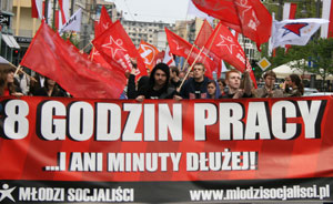 ![]() Głównym hasłem demonstracji było "8 godzin pracy i ani minuty dłużej". Skandowano także "Demokracji! Socjalizmu!" oraz "Podnieść płacę minimalną!". Adrian Zandberg, sekretarz krajowy MS mówił w trakcie pochodu, że wzrost gospodarczy nie może być wartością samą w sobie, zaś z jego efektów powinno korzystać całe społeczeństwo, a nie tylko elity. Jego zdaniem polityka społeczno-gospodarcza wszystkich rządów po 1989 roku opierała się na akceptacji pogłębiających się nierówności społecznych. "Chcemy więcej równości, silniejszych mechanizmów redystrybucji dochodu i majątku, wyższych nakładów na usługi publiczne" - mówił Zandberg. Demonstracja, którą uświetniały występy ulicznej grupy Samba Socialista Młodych Socjalistów zakończyła się wiecem pod Urzędem Miasta w Gdyni. Tam przemawiali liderzy MS i RACJI PL. Grzegorz Ilnicki, Sekretarz Krajowy MS mówił m.in., że to wstyd dla socjalistów, że po stu laty od ogłoszenia hasła 3 x 8 godzin, nadal przychodzi im walczyć o czas na pracę, wypoczynek i sen. Jego zdaniem to hańba dla Polski, że jest krajem, w którym pracownicy wykonują swoją pracę kosztem życia prywatnego i społecznego, pracując długo i za niską płacę. Przewodnicząca RACJI Polskiej Lewicy prof. Maria Szyszkowska mówiła, że człowiek zawsze musi być celem samym w sobie, a nie środkiem do realizacji politycznych planów. Według niej lewica oparta na solidaryzmie społecznym i dążeniu do neutralności światopoglądowej państwa, powinna odgrywać na scenie politycznej należną jej rolę. W innych wystąpieniach podkreślano problemy świata pracy oraz krytykowano Sojusz Lewicy Demokratycznej za neoliberalizm gospodarczy. Tzw. "zwrot w lewo" SLD nazywano pozorowanym i niewiarygodnym. Demonstrację bezskutecznie próbowała zakłócić grupka neonazistów. W Gdańsku i Gdyni nie odbyły się inne demonstracje z okazji Święta Pracy. Kilkunastu działaczy SLD i FMS, z przewodniczącym rady wojewódzkiej tej partii na czele, złożyło w Gdańsku kwiaty pod pomnikiem "Tym co za Polskość Gdańśka", a w Gdyni na Płycie Marynarza przy Skwerze Kościuszki. |