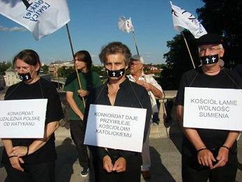 ![]() Motto, jakie przyświecało organizatorom brzmiało: "Nie pytaj, co Polska dała Tobie. Pytaj ile Kościół katolicki zagarnia z tego co Ty dajesz krajowi. My wiemy: od 5 do 7 miliardów złotych rocznie z naszych podatków! Z budżetu Polski!". Działacze RACJI Polskiej Lewicy oraz członkowie grupy aktorskiej wykrzykiwali hasła: "Konkordat odbiera Polakom a daje Kościołowi katolickiemu, Kościół łamie wolność sumienia, Konkordat uzależnia Polskę od Watykanu, Konkordat to fundament państwa wyznaniowego, Konkordat daje przywileje Kościołowi katolickiemu". Organizatorka i zarazem przewodnicząca warszawskiego koła RACJI Polskiej Lewicy Joanna Gajda, prezentowała warszawiakom argumenty, za wypowiedzeniem Konkordatu oraz jego negatywnych skutkach. Uznajemy ten dokument za symbol utraty przez Polskę suwerenności na rzecz Watykanu i Kościoła katolickiego w Polsce - stwierdziła. Umowa zapewnia Kościołowi rekompensaty mienia, choć ilość otrzymanych dóbr dawno już przekroczyła wartość utraconą, zatwierdza, wprowadzoną wcześniej w sposób nielegalny, naukę religii do szkół oraz narusza prawo rodziców do nie ujawniania swoich religijnych przekonań i praw dziecka do swobodnego rozwoju światopoglądowego - dodała. Happening na Starym Mieście wywołał spore zainteresowanie tematem podjętym przez członków RACJI Polskiej Lewicy |