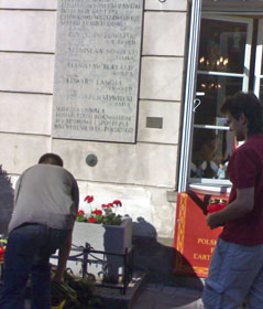 ![]() Wcześniej, pod tablicą znajdującą się na domu profesorów na warszawskim Starym Mieście, który był główną pozycją bronioną przez syndykalistów w 1944 roku, Młodzi Socjaliści, wspólnie z członkami stowarzyszenia "Wolność - Równość - Solidarność" złożyli kwiaty i zapalili znicze. |