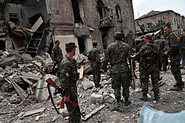 ![]() Dzień wcześniej, 8 sierpnia rozpoczęły się ciężkie walki między armią gruzińską a wojskami i milicjami ochotniczymi Południowej Osetii. Osetyńcy wystąpili zbrojnie na rzecz swojej niepodległości. Rząd Gruzji odpowiedział ogniem. Brytyjska BBC pokazała jak gruzińska armia wystrzeliwuje w kierunku Południowej Osetii tysiące pocisków wyglądających jak katiusze, co musiało spowodować wiele ofiar. Były informacje o zabitych cywilach, przedstawiciele rządu Rosji mówią o zabitych rosyjskich żołnierzach z sił pokojowych. Jeśli wierzyć przekazom medialnym, rosyjskie lotnictwo dokonało pięciu nalotów na cele wojskowe w okolicach gruzińskiego miasta Gori. Tam też mówi się o ofiarach wśród cywilów. Według rządu Gruzji, rosyjski nalot zniszczył w sobotę, 9 sierpnia także port czarnomorski Poti. Dziennikarz telewizji Al Jazeera Jonah Hull, zdający relacje z Gori, miasta leżącego 30 km od Południowej Osetii, mówił, że nikt się tu nie spodziewał, że [Gori] zostanie zaatakowane. Co najmniej jeden blok mieszkalny został trafiony przez bombę w wyniku czego zginęło 5 osób. To właśnie z gruzińskich baz wojskowych w Gori prowadzono ostrzał Południowej Osetii. Tego samego dnia, władze rosyjskie ogłosiły, że wyzwoliły stolicę Południowej Osetii, Cchinwali od Gruzji. Bataliony taktyczne całkowicie wyzwoliły Cchinwali od gruzińskich sił zbrojnych - powiedział generał Władimir Bołdyjew, zwierzchnik rosyjskich sił lądowych. Według wspieranej przez Rosję administracji Południowej Osetii, od czasu gdy wojska gruzińskie rozpoczęły atak na miasto Cchinwali, zginęło ponad 1600 osób. Później rosyjski ambasador w Gruzji podał liczbę 2 tysięcy ofiar po stronie południowych Osetyńców z Cchinwali. Premier Władimir Putin odwiedził Północną Osetię i oświadczył, że akcja rosyjskiej armii była dobrze przeprowadzona, uzasadniona a nawet konieczna. Tymczasem światowi przywódcy deklarują zatroskanie wydarzeniami w regionie. Amerykański prezydent George Bush, który niedawno poparł odłączenie się od Serbii Kosowa, a obecnie wypowiada się na rzecz odłączenia się od Chin Tybetu, nie popiera jednak niepodległościowych dążeń Południowych Osetyńców i deklaruje poparcie dla integralności terytorialnej Gruzji. Jestem głęboko zaniepokojony sytuacją w Gruzji - mówił prezydent Bush. Dodał, że ataki Rosji na Gruzję grożą niebezpieczną eskalacją kryzysu i przestrzegł Rosję przed kontynuowaniem zbrojnej akcji. Rząd Polski wezwał do niezwłocznego szczytu EU w celu przedyskutowania eskalacji konfliktu. Minister Radosław Sikorski wezwał polskich obywateli do opuszczania terytorium Gruzji. W sprawie konfliktu spotkali się brytyjski premier Gordon Brown i francuski prezydent Nicolas Sarkozy. Dimitrij Rogozin, ambasador Federacji Rosyjskiej przy NATO, powiedział dziennikarzom w Brukseli: To co mamy w Południowej Osetii może być nazwane jedynie czystkami etnicznymi i ludobójstwem. Prezydent Rosji powiedział prezydentowi Bushowi w trakcie ich rozmowy telefonicznej, że tylko wycofanie wojsk gruzińskich ze strefy konfliktu może zakończyć działania zbrojne. Gruzja jest bliskim sojusznikiem USA i nadzieją na zbliżenie się baz NATO do granic Rosji, posiada nowoczesne uzbrojenie amerykańskie i może liczyć na poparcie USA w sprawach swojej polityki wewnętrznej i międzynarodowej. Obecna sytuacja wydaje się być poważna, gdyż Gruzja jest w tym konflikcie terenem zderzenia interesów dwóch potęg światowych - USA i Rosji. Jednak Ivan Safranczuk, analityk militarny z działającego w Moskwie Centrum Obrony i Informacji powiedział: Nie ma obecnie wojny w pełnej skali i Rosja nie zamierza wywoływać wojny na pełną skalę. Rosja tylko pokazuje gotowość obrony swoich obywateli. Pamiętać trzeba, że większość mieszkańców Południowej Osetii ma paszporty Federacji Rosyjskiej. Rosja mówi, że właściwie odpowiada na bezpośredni atak na swoich obywateli i swoje "siły pokojowe" w Południowej Osetii - mówił w rozmowie z dziennikarzami mieszkający w Londynie rosyjski analityk Aleksander Nekrassow, który zauważa, że oczywiście jest to trudna sytuacja prawna, ponieważ mówiąc technicznie Południowa Osetia jest na terytorium Gruzji, więc jakiekolwiek duże ruchy wojsk rosyjskich mogą być interpretowane jako inwazja na Gruzję. Osetyńcy czy też Osetyjczycy to naród kaukaski, zamieszkujący przede wszystkim dwie niewielkie republiki - Osetię Północną, wchodzącą w skład Federacji Rosyjskiej, oraz Osetię Południową, wchodzącą w skład Gruzji, a także część Turcji. Ogólną liczbę Osetyjczyków ocenia się na ok. 700 tys, w tym 515 tys w całej Rosji, głównie w Osetii Północnej, 70 tys. w gruzińskiej części Osetii Południowej i 100 tys. w Turcji. Posługują się swoim narodowym językiem osetyjskim wywodzącym się z grupy irańskiej języków indoeuropejskich. Osetyjczycy są potomkami narodu Alanów. Dzielą się na: digorskich, adagirskich (waładżyrskich), kurtalińskich i tagaurskich. Osobną grupę tworzą Osetyjczycy zakaukascy (Tualtowie). Osetia Południowa to rejon w północnej Gruzji obejmujący tereny istniejącego do 1991 roku Południowoosetyjskiego Obwodu Autonomicznego wchodzącego w skład Gruzińskiej Socjalistycznej Republiki Radzieckiej. W 1991 roku lokalne władze utworzyły tam Republikę Południowej Osetii, która ogłosiła niepodległość, chcąc uniezależnić się od Gruzji. Jej niezależność nie została uznana przez Gruzję, a Południowa Osetia traktowana jest jako integralna część państwa gruzińskiego. Konflikt wokół Południowej Osetii to nie jedyny konflikt, z którym mają do czynienia władze w Gruzji. Inną prowincją, która chce się odłączyć od Gruzji jest Abchazja. Minister spraw zagranicznych tej prowincji ogłosił, że wojska separatystyczne zamierzają zmusić armię gruzińską d