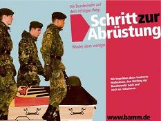 ![]() Na plakacie widać niemieckich żołnierzy niosących trumnę przykrytą narodową flagą. Podpis głosi: "Bundeswehra na właściwej drodze: o jednego mniej to krok ku rozbrojeniu". Obraz jest dostępny na internetowych stronach organizacji pacyfistycznych. Przedstawiciele organizacji pacyfistycznych w Niemczech tłumaczą, że chcą w ten sposób wywołać dyskusję na temat dalszej obecności Bundeswehry w Afganistanie. Jesienią bowiem, parlament ma przedłużyć mandat niemieckiej armii w tym kraju. Mimo niewielkiej liczby,to jednak kontyngent trzech i pół tysiąca żołnierzy niemieckich stacjonuje w spokojniejszej, północnej części kraju, jednak również tam żołnierze narażeni są na niebezpieczeństwo. Przed tygodniem jeden z nich zginął w wybuchu przydrożnej bomby. |