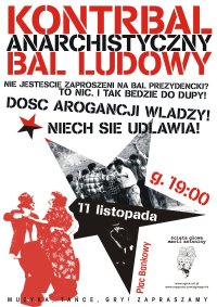 ![]() W przeciwieństwie do balu prezydenckiego u nas na pewno pojawią się zaproszeni goście. To aktywiści z Rosji i Niemiec - twierdzą organizatorzy. Kontrbal anarchistyczny rozpocznie się 11 listopada o godz. 19.00 na placu Bankowym. Będą pokazy fireshow, teatr uliczny, dużo tańca i muzyki. A także otwarta mównica - dla każdego, kto będzie chciał się wypowiedzieć. Ponadto, będą mogli pójść na afterparty w squacie Elba. W planie są min. koncert, filmy i rozmowy o patriotyzmie. "Dość imprez dla polityków! Organizujemy imprezę dla ludzi!" - zachęcają plakaty organizatorów. Na jednym z plakatów promujących kontrbal możemy przeczytać: "Nie jesteście zaproszeni na bal prezydencki? To nic. I tak będzie do dupy". |