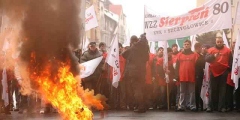 ![]() Wzięli w niej udział pracownicy różnych branż, choć najliczniejszą grupę stanowili górnicy. W trakcie demonstracji skandowano antyrządowe hasła, palono opony, wybuchały też petardy. Górnicy domagali się podwyżek płac w KW o 14 procent, w KHW o 12 proc., a w Jastrzębskiej Spółce Węglowej o 10 proc. "Złodzieje!" - krzyczano pod adresem zarządu Kompanii, którego pensje wzrosły o 6,9 proc., a który sam proponuje podwyżkę dla górników w wysokości 1,2 proc. Pod Holdingiem postawiono ultimatum - albo rozmowy, albo strajk. Z kolei szef "Sierpnia 80" w JSW, Krzysztof Łabądź mówił, że zamrożenie płac równa się ich obniżeniu. To w rezultacie daje obniżenie płac dla wszystkich pracowników JSW o 200 zł średnio miesięcznie - powiedział. Inny związkowiec, Przemysław Skupin sprzeciwił się konieczności odpracowywania przez górników 18 lat wstecz wszystkich dni spędzonych na zwolnieniu lekarskim przed, by móc udać się na emeryturę. Tłumaczył, że oznacza to dla wielu osób nawet 5 lat dodatkowej pracy. Domagamy się zmiany polityki społeczno-gospodarczej rządu. Uważamy, że realizowanie polityki pod dyktat pracodawców i lobby biznesowego nie służy społeczeństwu i jest dla niego groźne. Musimy więc protestować i stawiać żądania - także płacowe. Domagamy się m.in. wzrostu płacy minimalnej o co najmniej 500 zł - mówił Bogusław Ziętek, przewodniczący Komisji Krajowej WZZ "Sierpień 80". Wśród przemawiających była m.in. Elżbieta Fornalczyk z Tesco, która mówiła, że koszty kryzysu są w skandaliczny sposób przerzucane na pracowników, którzy pracują ponad własne siły. Przeciwko prywatyzacji szpitali protestował Grzegorz Kulczycki ze Stowarzyszenia Emerytów i Rencistów "Weterani Pracy". Związkowcy "Sierpnia 80" z Tramwajów Śląskich złożyli na ręce wojewody śląskiego, Zygmunta Łukaszczyka petycję z wnioskiem o interwencję w sprawie likwidowania w aglomeracji katowickiej połączeń tramwajowych w Gliwicach i Będzinie. Kilka dni temu na ulice Francji wyszły 2 mln ludzi i znalazły się 2 mld euro na pomoc dla najbiedniejszych. Jeżeli w Polsce ludzie pracy i najbiedniejsi będą protestować, również wywalczą dla siebie osłony - stwierdził na zakończenie szef WZZ "Sierpień 80". |