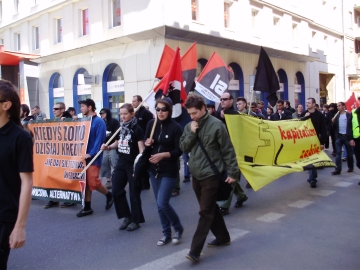 ![]() Lokatorzy z Mińska Mazowieckiego mówili o tragicznej sytuacji mieszkaniowej panującej w ich mieście. Około godziny 11.00 pod budynkiem giełdy rozpoczęła się demonstracja zorganizowana przez Lewicową Alternatywę, Nową Lewicę, Komunistyczną Partię Polski, Pracowniczą Demokrację i Stowarzyszenie "Wolność - Równość - Solidarność". Wzięło w niej udział ponad 300 osób. Obecni byli również członkowie Ogólnopolskiego Związku Zawodowego Inicjatywa Pracownicza, Polskiej Partii Socjalistycznej, Związku Syndykalistów Polski i Młodych Socjalistów, a także działacze organizacji lokatorskich - Kancelarii Sprawiedliwości Społecznej i Warszawskiego Stowarzyszenia Lokatorów. Zebrani przynieśli transparenty "Stop represjom za działalność związkową" (OZZ IP), "Kiedyś zomo dzisiaj banki, nie daj się trzymać w szachu" (LA) i "Kapitalizm zabija" LA. Główny transparent głosił "Kapitalizm nie działa". Piotr Ciszewski z LA stwierdził, że hasło pochodu brzmi kiedyś zomo dzisiaj banki, ponieważ dawną dyktaturę partyjnej oligarchii zajmuje dziś dyktatura banków i kredytów uzależniających ludzi na wiele lat. Dodał, że tocząca się obecnie debata polityczna to farsa opierająca się na tym co powiedział Janusz Palikot czy Jarosław Kaczyński zamiast faktycznych problemach społecznych. Przedstawiciel Nowej Lewicy mówił o znaczeniu 1 maja jako dnia walki o prawa ludzi pracy. Zebrani przeszli następnie pod budynek giełdy papierów wartościowych, gdzie wystąpił Andrzej Smosarski (LA), który powiedział, że giełda polega na graniu w ruletkę miejscami pracy, zwłaszcza w sytuacji kryzysu ekonomicznego. Podczas przemarszu spod giełdy demonstranci napotkali kilku członków neofaszystowskiej organizacji Falanga, w których kierunku poleciały z pochodu petardy. Demonstranci przeszli głównymi ulicami miasta, skandując "Dość bankowej dyktatury", "Nasze prawo, prawo pracy", "Kiedyś zomo dzisiaj banki" oraz "Rząd na bruk, bruk na rząd". Wznoszono też hasła lokatorskie - "Lokatorzy to nie towar", "Chcemy mieszkań komunalnych" i "Mieszkanie prawem nie towarem". Demonstracja zatrzymała się pod Kancelarią Prezesa Rady Ministrów. Beata Karoń z KPP stwierdziła, że kryzys jest nieunikniony w gospodarce kapitalistycznej. Powiedziała, że należy wystąpić przeciwko stałemu pogarszaniu się warunków pracy, "uelastycznianiu" kodeksu pracy, zmuszaniu pracowników do pracy w nadgodzinach, zatrudnianiu bez umowy o pracę i nieuzasadnionemu obniżaniu wynagrodzenia. Piotr Ikonowicz (NL) stwierdził, że rządzących nie obchodzi los lokatorów czy pracowników. Demonstracja zakończyła się pod siedzibą Polskiej Konfederacji Pracodawców Prywatnych Lewiatan. Działacze LA spalili podobiznę przewodniczącej PKPP Lewiatan Henryki Bochniarz. Marek Garztecki z PPS przyrównał kapitalizm do panującej obecnie świńskiej grypy. Wyraził przekonanie, że obie zarazy zostaną wkrótce pokonane. Przedstawiciel NL stwierdził, że PKPP Lewiatan to grupa roszczeniowo nastawionych zatrudnicieli, a to właśnie pracownicy są prawdziwymi pracodawcami, ponieważ dają swoją pracę tym, którzy ich zatrudniają. |