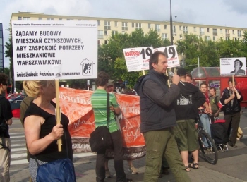 ![]() Demonstrację wsparły Lewicowa Alternatywa, Związek Syndykalistów Polski i Polska Partia Pracy. Hasło protestu było odpowiedzią na slogan promocyjny miasta "Warszawa stolicą kultury 2010". Lokatorzy twierdzili, że jeśli dotychczasowa polityka miasta polegająca na reprywatyzowaniu zasobów komunalnych i podwyższania czynszów zostanie utrzymana to miasto stanie się stolicą bezdomności. Jako ostrzeżenie przed wejściem do ratusza stanął namiot i domek z tektury. Jakub Gawlikowski z KOL i ZSP przypomniał, że decyzje o podwyżkach czynszów w lokalach komunalnych władze miasta podjęły bez przeprowadzenia konsultacji społecznych. Wypomniał również radnym i urzędnikom samorządowym, że twierdzą iż miasto nie ma pieniędzy a sami przyznają sobie premie. Andrzej Smosarski przypomniał twierdzenia wiceburmistrza warszawskiej dzielnicy Wawer, który stwierdził, że miasto nie jest od dawania mieszkań, a sam zamieszkuje w lokalu komunalnym. Dodał, że organizacje lokatorskie będą domagały się informacji o tym którzy samorządowcy korzystają z mieszkań komunalnych. Lokatorzy przypominali, że na poprzedniej sesji Rady Miasta pozbawiono ich możliwości zabrania głosu, usuwając z porządku obrad dotyczący ich punkt. Zapowiadają protest podczas następnej sesji Rady 9 lipca. Organizator demonstracji powiedział, że w związku z nią odwiedziła go w pracy policja, próbując dowiedzieć się czy lokatorzy będą organizować miasteczko namiotowe pod ratuszem. |