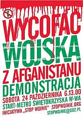 Podobnie jak w wielu miastach na całym świecie 24 października, w kolejną rocznicę napaści na Afganistan, w Warszawie odbędzie się demonstracja antywojenna. Zorganizowana przez Inicjatywę "Stop Wojnie" demonstracja rozpocznie się w samym sercu Warszawy, przy stacji metra Świętokrzyska, o godzinie 13.00.