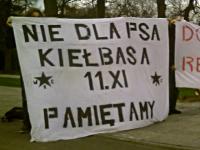 ![]() Rozwinięto dwa duże transparenty: "Nie dla psa kiełbasa! WRS: 11 listopada - pamiętamy" oraz "Dość represji". |