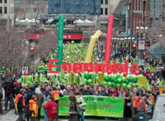 ![]() Akcję zorganizowały wspólnie trzy największe federacje związkowe w Quebecu - Konfederacja Narodowych Związków Zawodowych (Confédération des syndicats nationaux), Federacja Pracy Quebecu (Fédération des travailleurs et travailleuses du Québec) i Międzyzwiązkowy Sekretariat Usług Publicznych (Sécretariat intersyndical des services publics), które skupiają łącznie 475 tysięcy osób. Do tłumu przemawiali liderzy wszystkich trzech central - Claudette Carbonneau z CSN, Michel Arsenaul z FTQ oraz Dominique Verreault z SISP. Wszyscy oni krytykowali liberalny rząd Jeana Charesta za działania, które mają doprowadzić do zamrożenia płac w sektorze publicznym na najbliższe trzy lata (pracownicy domagają się podwyżki na poziomie 3,75 proc. co roku). Demonstrację wsparła lewicowa partia Solidarność Quebecka (Québec solidaire), natomiast zdystansowała się od niej główna siła lewicowej opozycji w prowincji, Partia Quebecka (Parti Québécois), której przewodnicząca Pauline Marois stwierdziła, że żądania związkowców są zbyt wygórowane. |