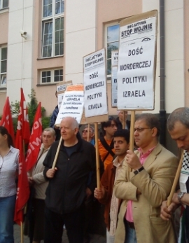 ![]() Wśród protestujących pod ambasadą Izraela byli przedstawiciele mieszkających w Polsce Palestyńczyków oraz działacze antywojenni. Maciej Wieczorkowski z Inicjatywy "Stop Wojnie" powiedział, że widzi iż nie znajduje słów na nazwanie aktu terroru jaki miał miejsce. Filip Ilkowski z ISW i Pracowniczej Demokracji przypomniał, że do ataku doszło na międzynarodowych wodach, a członkowie konwoju mieli pełne prawo bronić się przed aktem piractwa. Mówił o tym iż na pokładzie jednego ze statków była Polka - Ewa Jasiewicz. Pytał czy atak na turecki statek będzie potraktowany jako napaść na jeden z krajów NATO zobowiązująca Sojusz do odpowiedzi, ponieważ takiego uzasadnienia użyto przecież po 11 września 2001 roku, kiedy wojska NATO najechały Afganistan. Piotr Ikonowicz z Nowej Lewicy mówił o zbrodniczym charakterze oblężenia Gazy. Wyraził również nadzieję, że działacze pokojowi nie dadzą się zastraszyć i wkrótce w celu przełamania blokady wyruszy nie osiem, ale osiemdziesiąt statków Przedstawiciele diaspory palestyńskiej dziękowali za wyrazy solidarności. Jeden z nich stwierdził, że Izrael jest jak pies trzymany na smyczy przez USA i Stany Zjednoczone są współodpowiedzialne za zbrodnie izraelskiej armii. Piotr Ciszewski z Lewicowej Alternatywy nazwał izraelskich komandosów piratami groźniejszymi od somalijskich bo działającymi w celu mordowania ludzi niosących pomoc humanitarną. Wezwał też do solidarności ze sprawiedliwymi wśród narodu izraelskiego, którzy nie dali się ogłupić rządowej propagandzie. Zebrani w ramach happeningu przynieśli ze sobą przedmioty jakich Izrael nie pozwala dostarczać do Gazy, takie jak ołówki, książki, chleb, gazety czy kredki świecowe. Skandowano "Dość terroru Izraela!" i "Apartheid stop!" |
